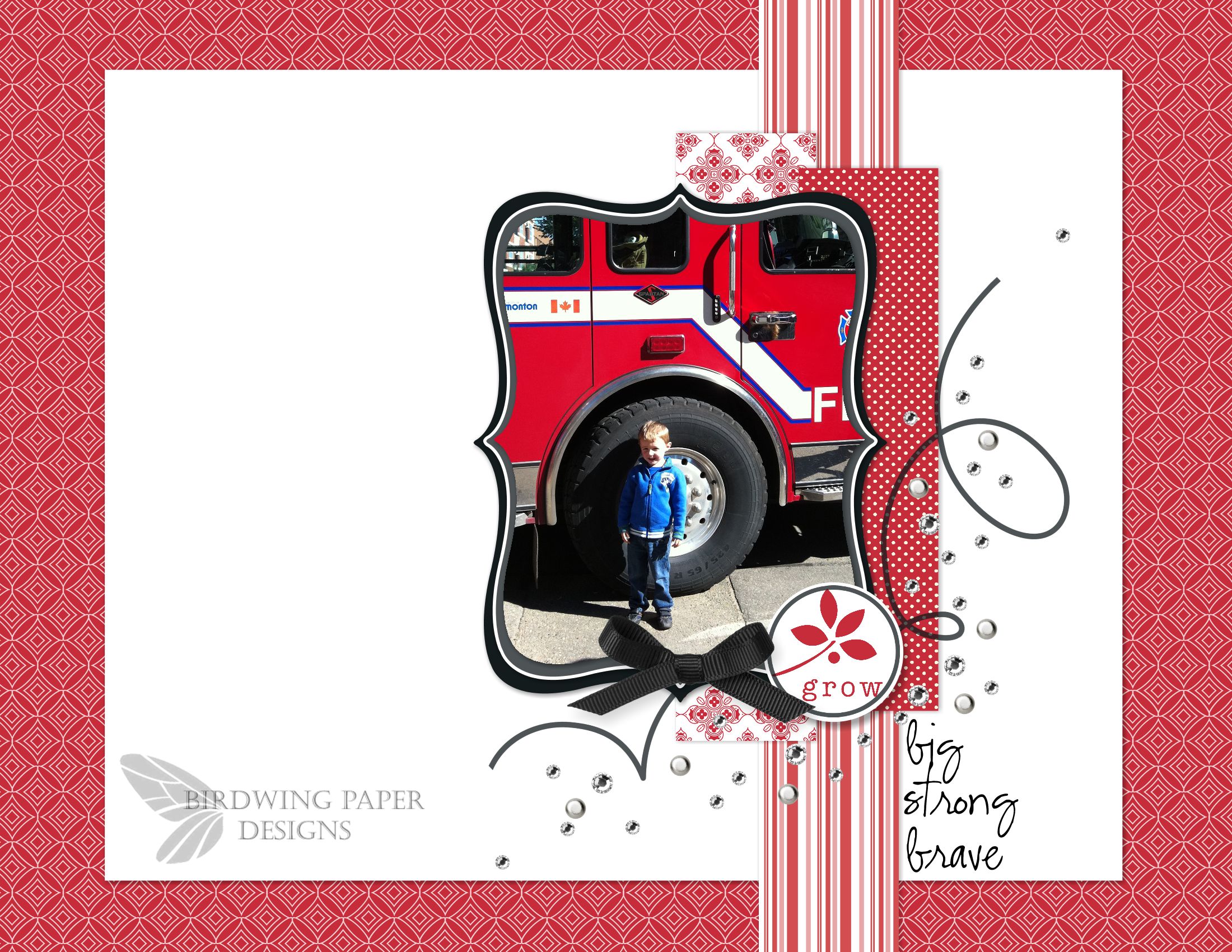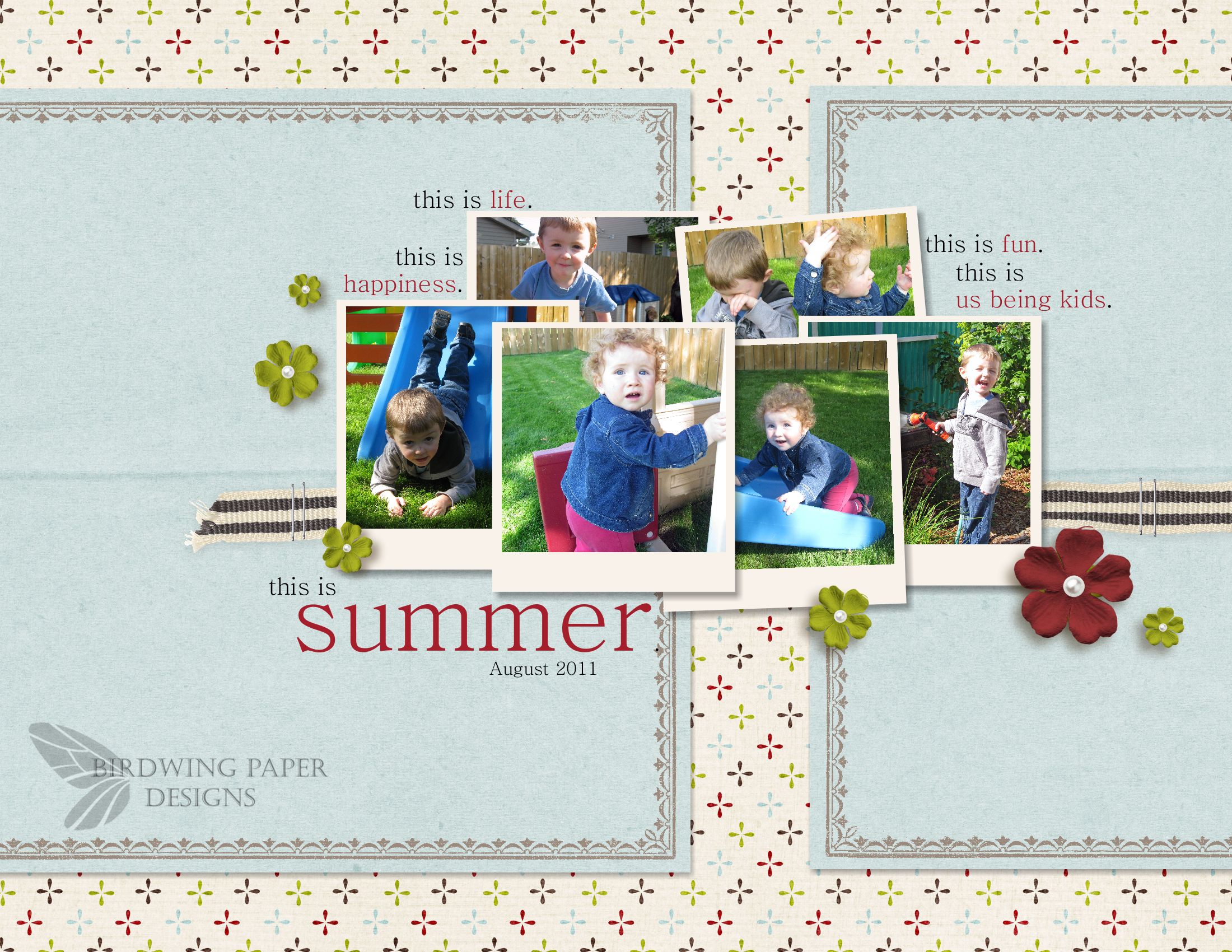 Now that I am able to scrapbook again, I am also busy shopping for new designer kits to use in the photobooks. I have been looking at so many talented designers and today I bought a kit from Paislee Press called Adorned. I love it because it is a Christmas kit that isn’t traditional and can be used for so many other occassions. The page I have posted today is using this kit and my photos are definitely not of the Christmas spirit!
