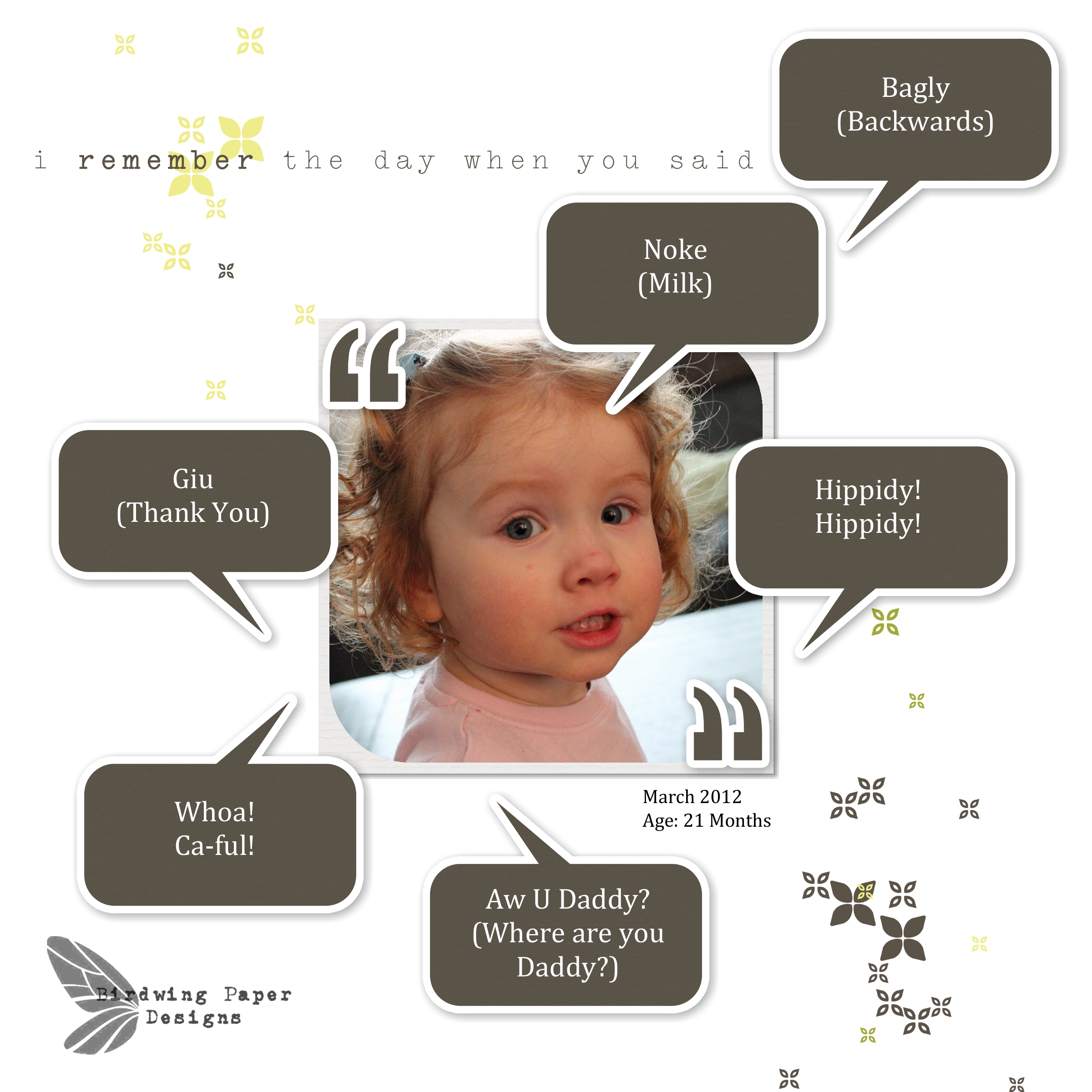 Robyn is almost two and, at this age, she says some funny words! In a few years I know we will never remember the way she mispronounces most of her words and this is one of the things I don’t want to forget. So I always try to include a page in my family album about all the words they are learning when they go through this word explosion phase.