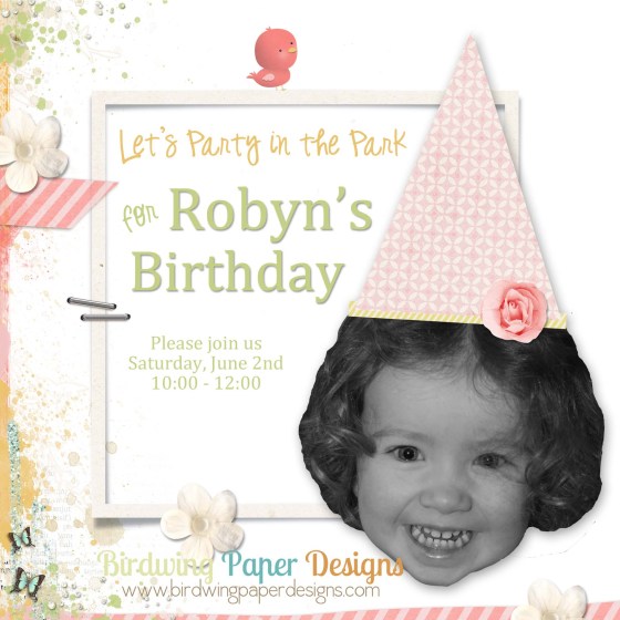 One week after Casey’s birthday is Robyn’s turn. I like it that their birthdays are close as I have a crazy few weeks and then it is done. Thankfully, Robyn is only turning two so she won’t care what her birthday party is like. I am hoping for a really great day and have the party at the local playground. That way the birds and the squirrels can clean up all the crumbs! Her invitation was a bit trickier because of all her hair in the photo. This was the best I could do!