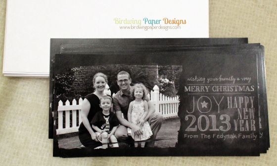 All you have to do is email me (lfedynak@gmail.com) what card you are interested in, I will send you a link to upload your photo(s) and what info I need to complete the card, and that is it! When the card is done I will email you a sample and if all is good it is sent to the printers. Once I receive the printed cards, about three weeks later, I will let you know and arrange for pick up or delivery. Now you can check that chore off your Christmas to do list!! I decided to go with the Chalkboard Christmas for my own family this year: