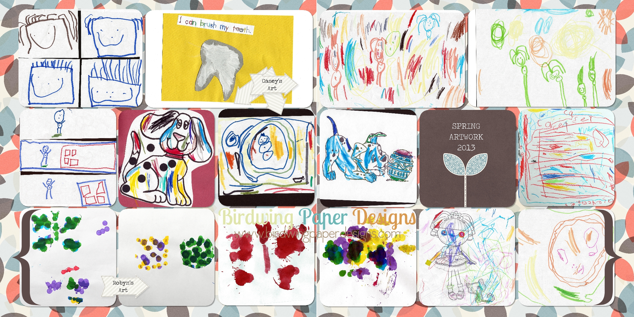 Here is a page of my kids’ artwork. I love the faces and people that Casey is starting to draw. All of the people have little belly buttons, so cute!! As Casey describes the pictures, “All the faces with falling down hair are girls and the ones with stand up hair are boys.”