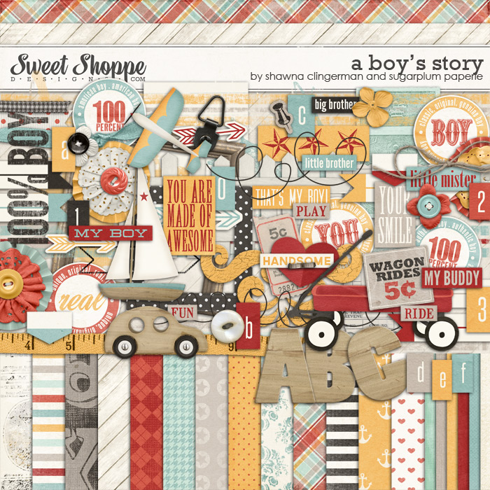 Last fall I was asked by a friend to make a baby book for her son and I jumped at the chance to design another photo book. Her son is now five and this wasn’t going to be just a baby book, but a baby/toddler/look-at-me-growing-into-a-big-boy book! At the time I was just finishing a course on how to create digital scrapbook products and there just wasn’t enough time to make a kit myself to be used in this book. Luckily, I found a great digital kit from the Sweet Shoppe called “A Boy’s Story” designed by Shawna Clingerman and Sugarplum Paperie.