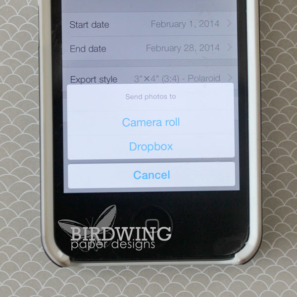 The cards can go to the camera roll or Dropbox which is a free file sharing service. I chose to just send them to the camera roll and then moved the photos from there to iPhoto.
