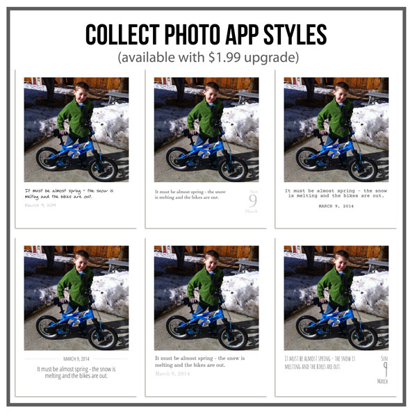 If you are looking for a simple way to document daily photos, I encourage you to check out the Collect App and give it a try. Even if you do nothing with the photos or the cards it is a nice record of the years events. I often flip through the Collect App photos (instead of the camera roll) when I am showing the grandparents some pictures of the kids because it just shows the highlights of our life.