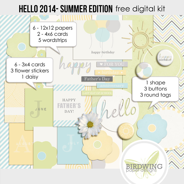 The summer edition of the Hello 2014 digital kit is now available as a free download on the Birdwing Paper Designs Facebook Page.