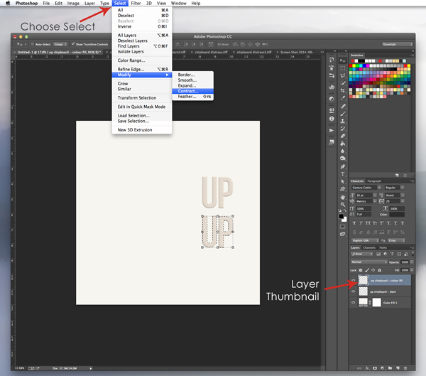 To distress the chipboard, we begin by selecting the letters as usual (CMD/CTRL + Layer Thumbnail), but when adding colour, we want to pull it away from the edges of the letters a bit. To do that go to Select > Modify > Contract, and from the menu that appears select “Contract By 10 Pixels” > OK.