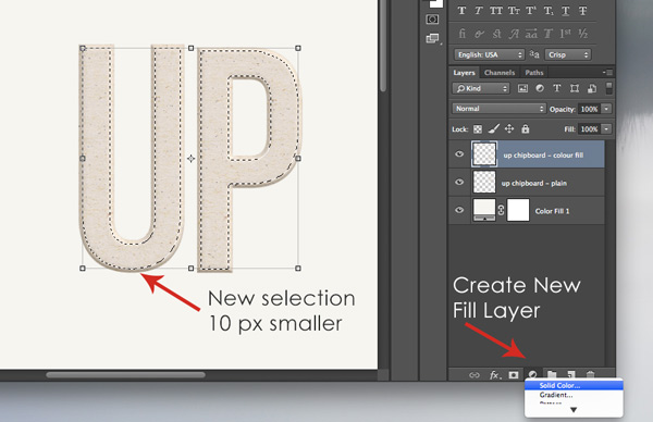 As seen below, the new selection has pulled away from the edge of the letters by 10 pixels. Now add some colour: Create New Fill Layer > Solid Color > Choose colour.