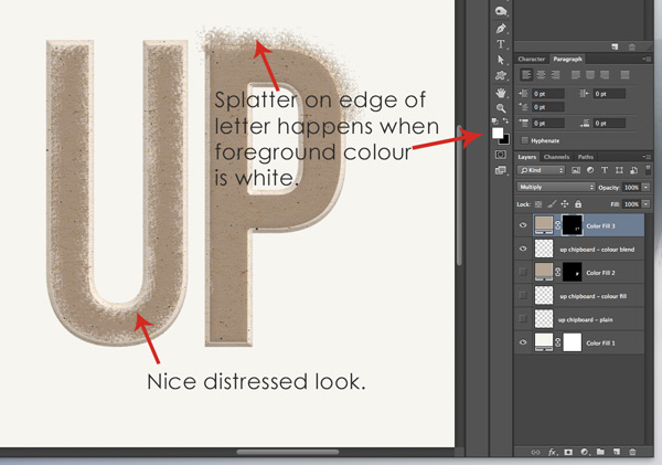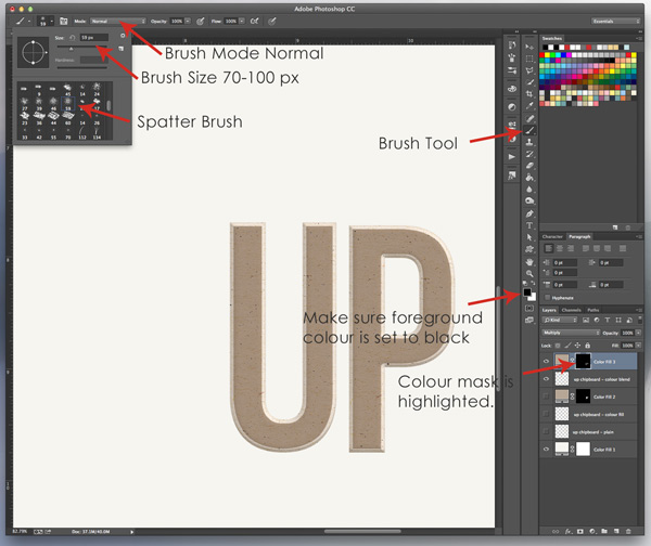 If nothing happens when using the brush, double check that the Colour Mask is highlighted, not the Colour Fill Layer Thumbnail. Or if the spatter shows up outside the letter, make sure the foreground colour is set to black and not white. I only mention these two tips because I made both of these mistakes when I first learned how to distress chipboard!!