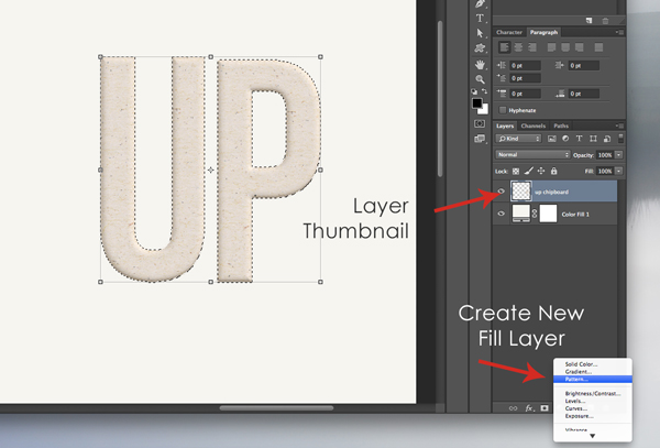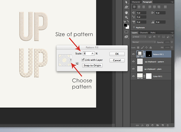 The Pattern Fill menu will appear. Select the type of pattern and scale/size. Click OK and the pattern will appear only on the letters chosen. If you need to change the type or size of pattern, the menu can always be accessed by double clicking on the Pattern Fill Layer Thumbnail.