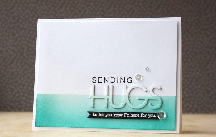 The idea for this month’s card came from Pinterest (seen below) and the effect with the word “hugs” intrigued me so much I had to find out how it was created and try it out myself.
