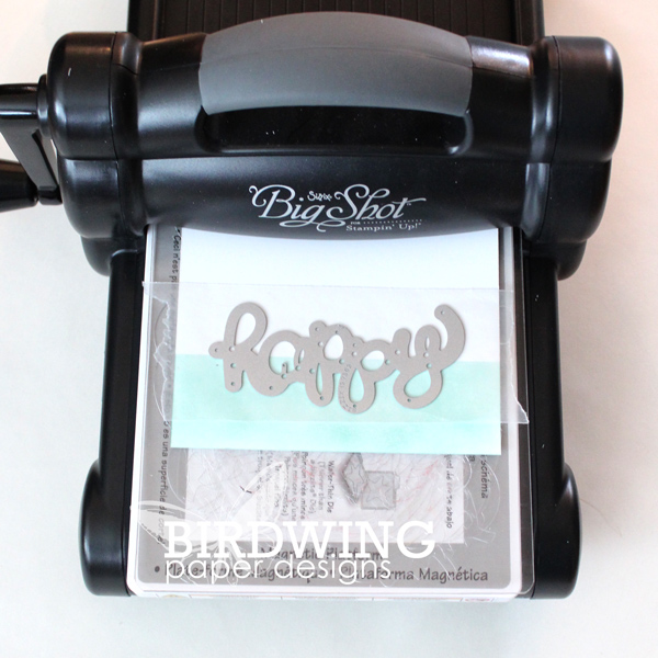 Next, the Big Shot was used with the “happy” Thinlit Die to cut out the word. I cut out 2 words from extra white card stock and then one more from the paper inked above. Just remember to keep all the little pieces from that inked paper.
