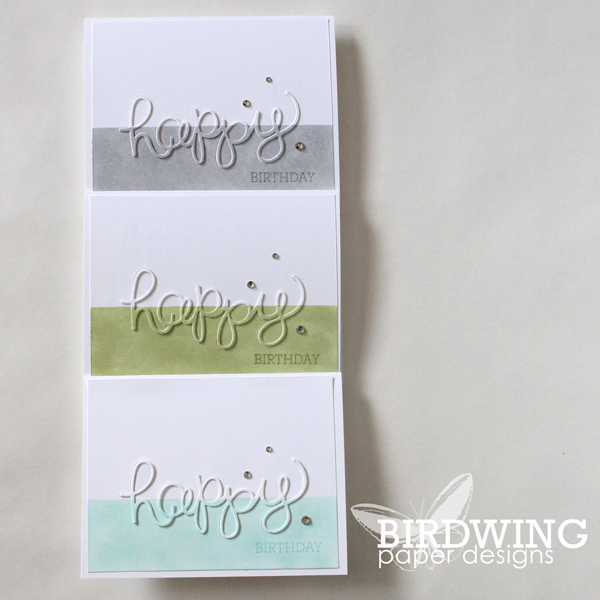Once that step is done, use little dots of glue on the white “happy” to adhere one more white copy. This will give the word a bit of depth. You can use more layers to make the word pop out more, but I was making 10 cards and didn’t want to spend all day cutting out paper! Finally, glue down the inked “happy” to get this awesome raised effect.