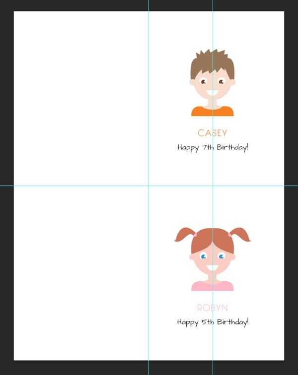 On the document I set a few guides to outline the edges of the front of the card and the centres to help place the images. Then some text was added to wish the cute little guy a Happy Birthday!