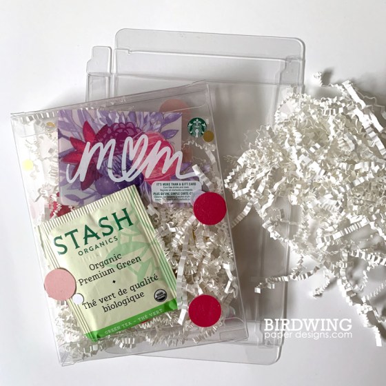 For the gift box, I used a clear acetate card box and filled it with white shred, coloured paper dots, and iridescent sequins. Using this as the basic gift box, any small gift can be added to it. For this post, I added a gift card and tea, but you could also include jewellery, flower seed packs, or photos of the kids.