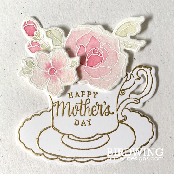 The flowers in this stamp set are perfect for colouring with watercolours. I started by embossing the flowers in white and then softly adding some colour. The teapot and cup were embossed in gold to give them some contrast.