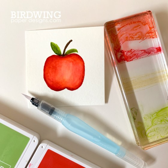 The next card was created using ink (Poppy Parade, Real Red, Granny Apple Green, Mossy Meadow, Early Espresso) to watercolour a bright red apple.