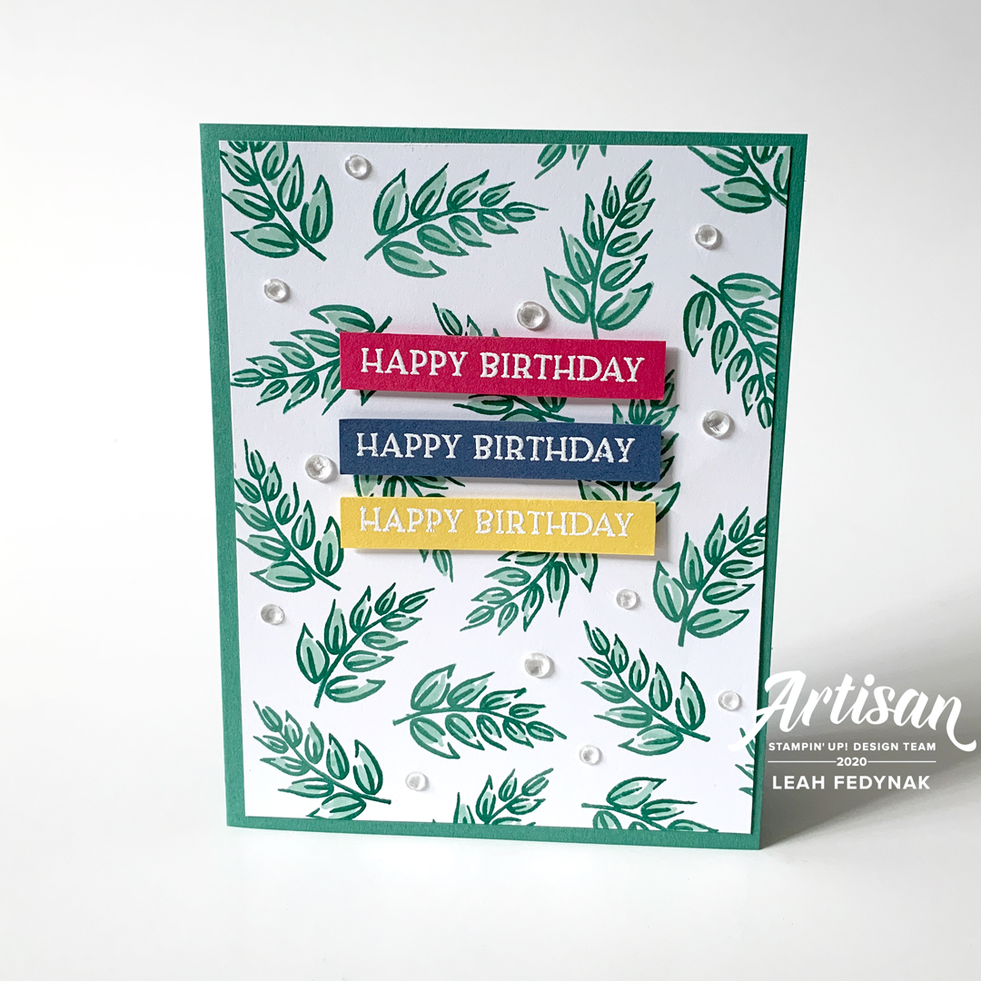 The third card I made was another birthday card, but this time used a leaf stamp from the Tag Buffet stamp set to create a lovely background coloured with Just Jade Stampin’ Blends. The repeating Happy Birthday is the same one used in the above card, but this time embossed in white on colourful card stock.