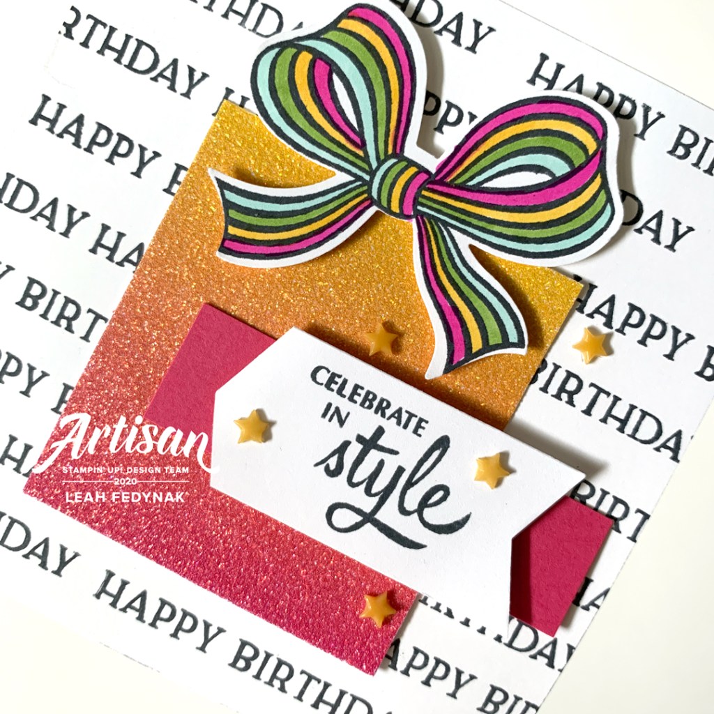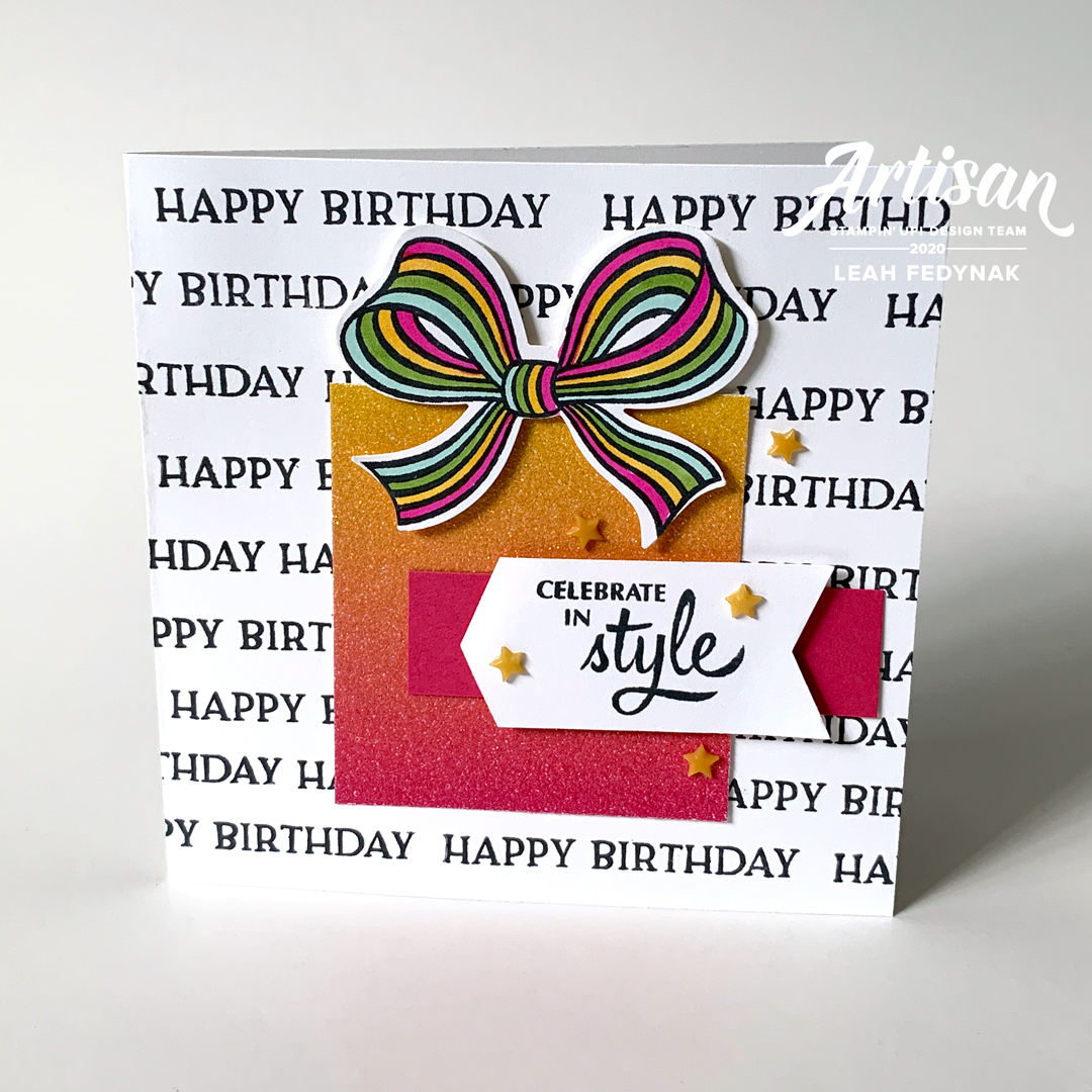 The second card was a fun birthday card with a glittery present (Rainbow Glimmer Paper) topped off with a colourful bow from the Gift Wrapped Bundle. I also used the Happy Birthday stamp from Blossoms in Bloom to create the background .