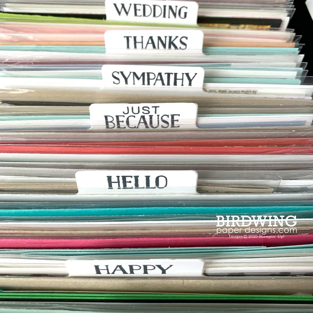 Each set includes 10 divider tabs to help organize your greeting cards: Baby, Birthday, Congrats, Happy, Hello, Just Because, Sympathy, Thanks, Wedding, and Misc.
