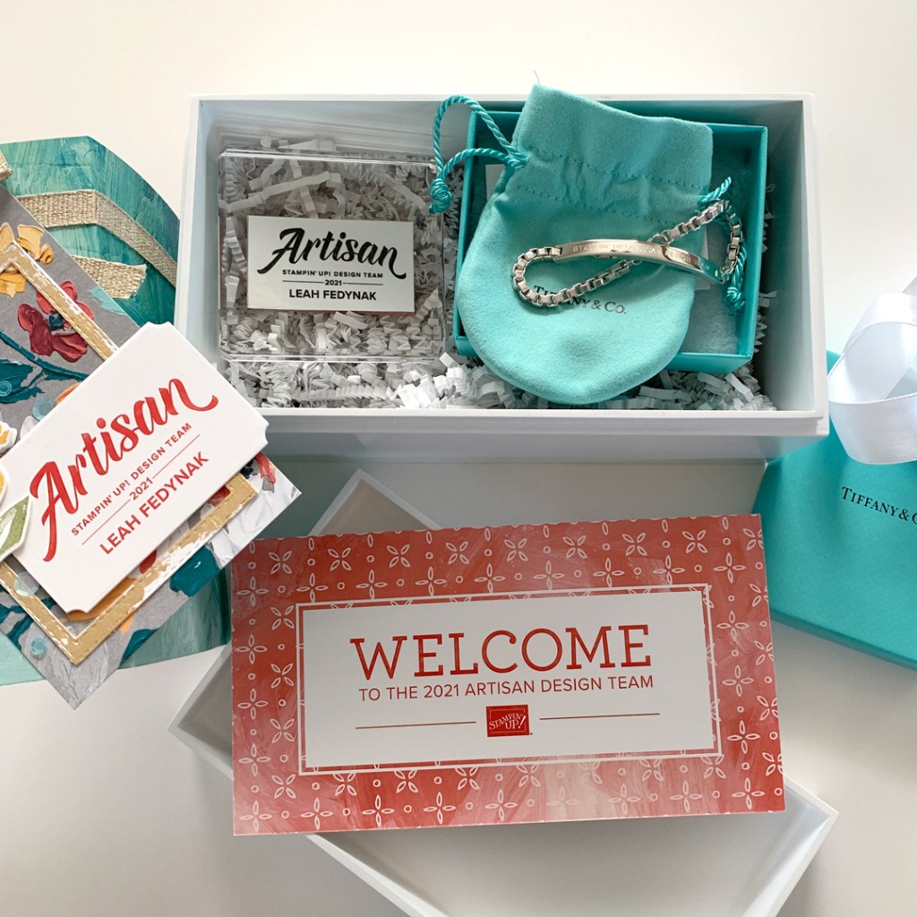 Stampin’ Up! spoils it Artisans with a beautiful box of gifts each year. We each received a personalized stamp and a gorgeous Tiffany bracelet!