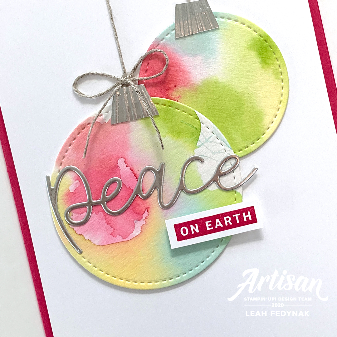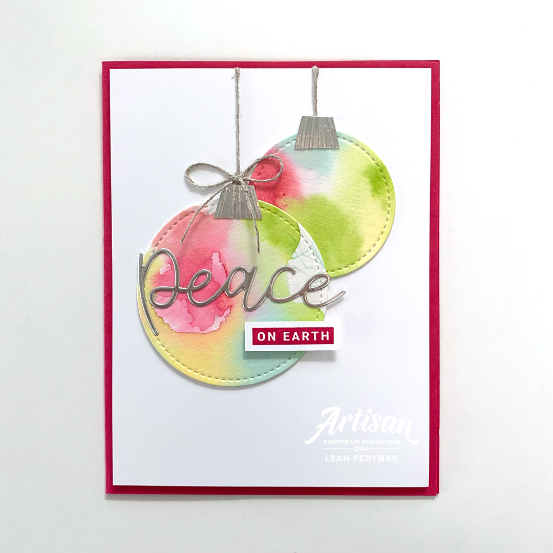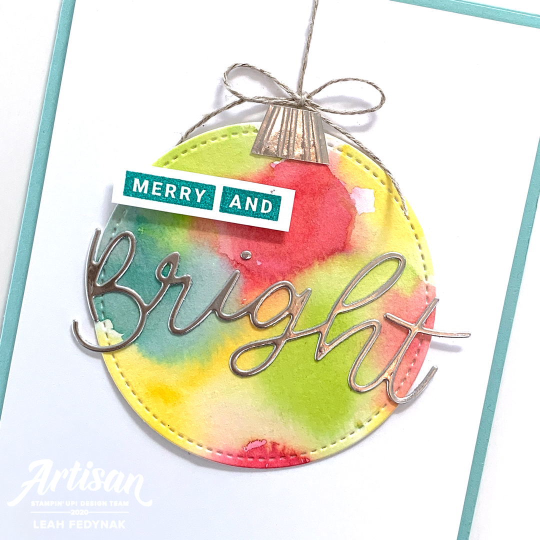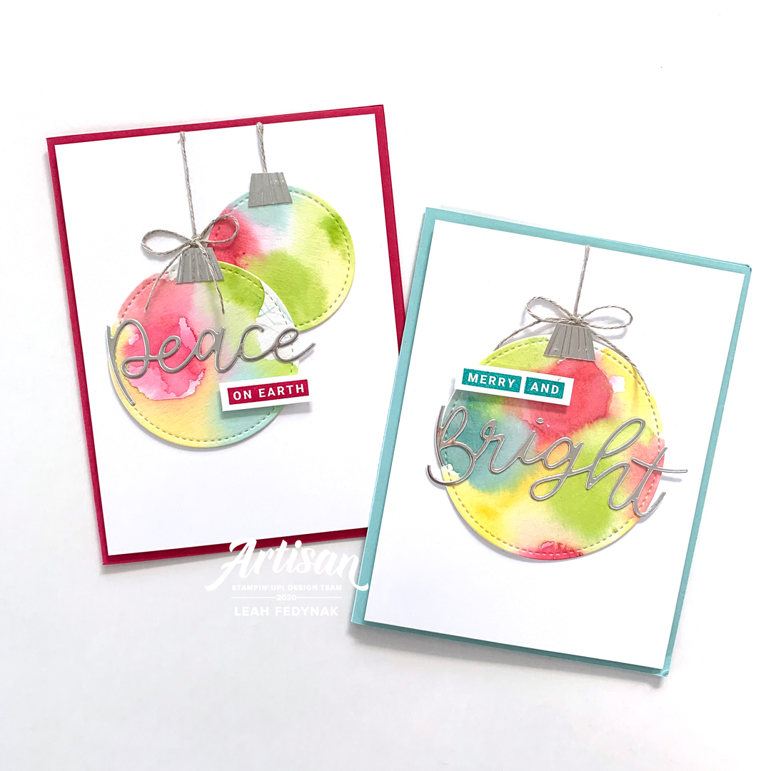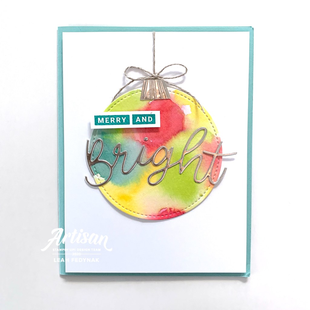As I started making holiday cards, I realized the colourful paper would be great die cut into circles and used as ornaments! The colours (Melon Mambo, Granny Apple Green, Daffodil Delight, Coastal Cabana) were not traditional Christmas colours which is what really makes these cards stand out!