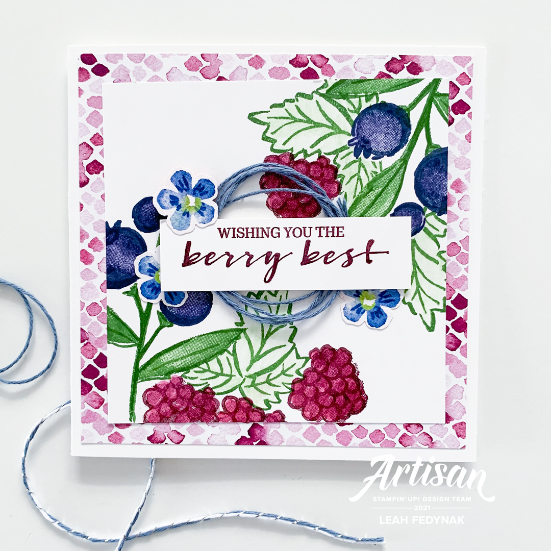 The final card was a combination of Strawberry Builder Punch, Berry Blessings stamp set, and Berry Blessings DSP. The latter two products come as a set and are free with the purchase of $120 CDN or more.