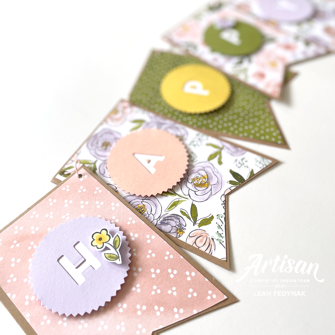 To make this Happy Easter bunting I combined current and retired Stampin’ Up! products. The current products I used were the Springtime Joy stamp set coloured with Stampin’ Blends, Playful Alphabet Dies, Pearl Basic Jewels, and Blushing Bride Baker’s Twine. The DSP used for the background is a retired paper, Best Dressed, and the Starburst punch is also retired.