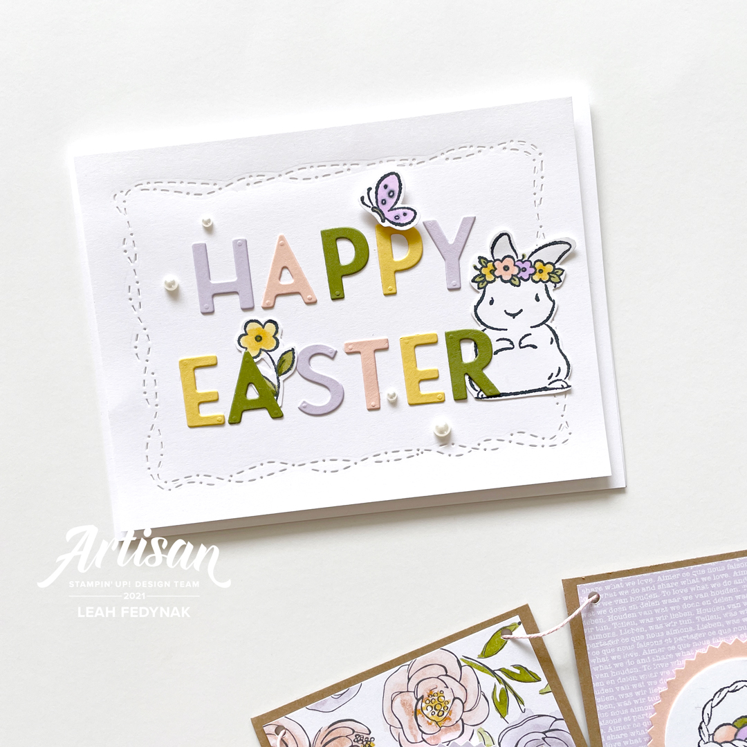 I pulled colours from the DSP to be the main focus for “HAPPY EASTER” – Purple Posy, Petal Pink, Daffodil Delight, and Old Olive. Each letter was die cut from the punched paper and backed with white card stock so it stood from the background. Some of the letters were accented with stamps from Springtime Joy along with the Easter basket that makes up the space between words!