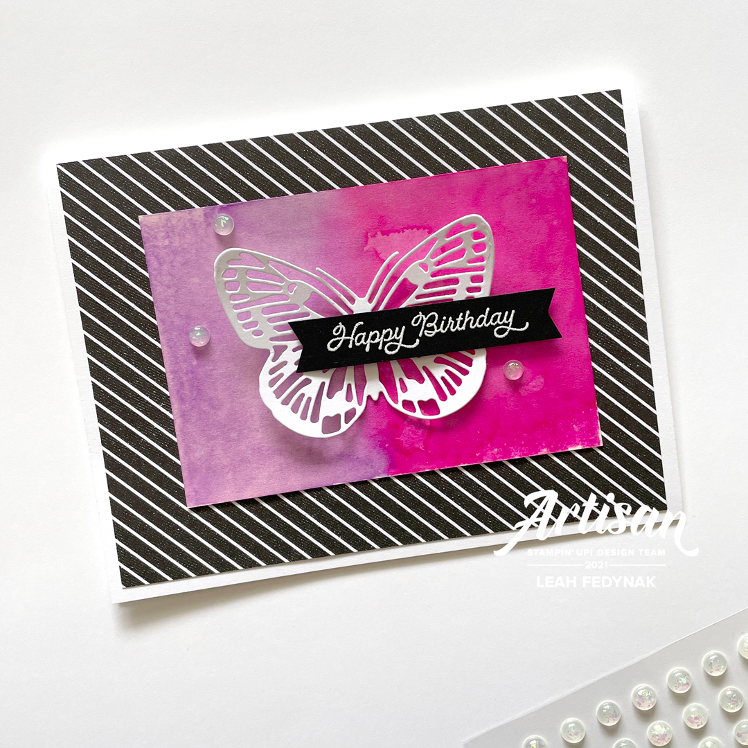 I blended a 2.75″ x 4″ piece of paper and added it to a card as a wonderful pop of shimmery colour. I kept the other colours neutral with black and white True Love DSP on the background, a white die cut butterfly (Brilliant Wings Dies), and simple birthday sentiment (Posted For You) embossed in white.