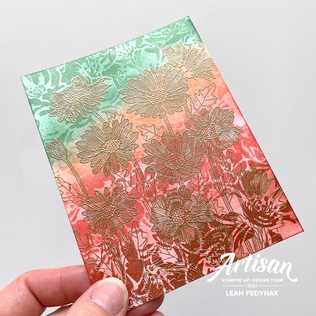 • Unfortunately, I don’t have video instructions for it! I wish I did!! Step 4 is basically just adding the gold emboss – stamp the daisies with Versamark on the Wild Roses background, add Gold Embossing Powder, and set with the heat tool. Just make sure to clear off any stray embossing powder before heating it or the image will look messy (one of my pet peeves). I just use a small, dry paint brush to do that. Step 5 is simply colouring in the daisy image with the white chalk marker. The white chalk can stick to the gold emboss, so just wipe it off as you go. It’s a bit time consuming since it’s such a big image, but totally worth it to make the daisies pop from the background! I hope that helps!!
