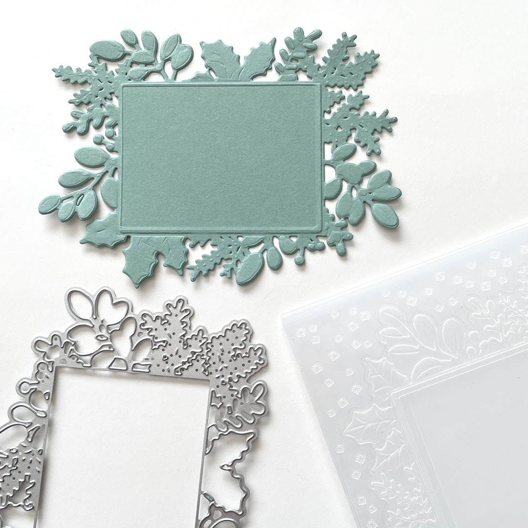 The bundle consists of the Merriest Moments stamp set, Merriest Frames Hybrid Embossing Folder, and coordinating dies. The hybrid embossing folder is a combo of embossing + die cutting and offers a variety of combinations to create different looks: