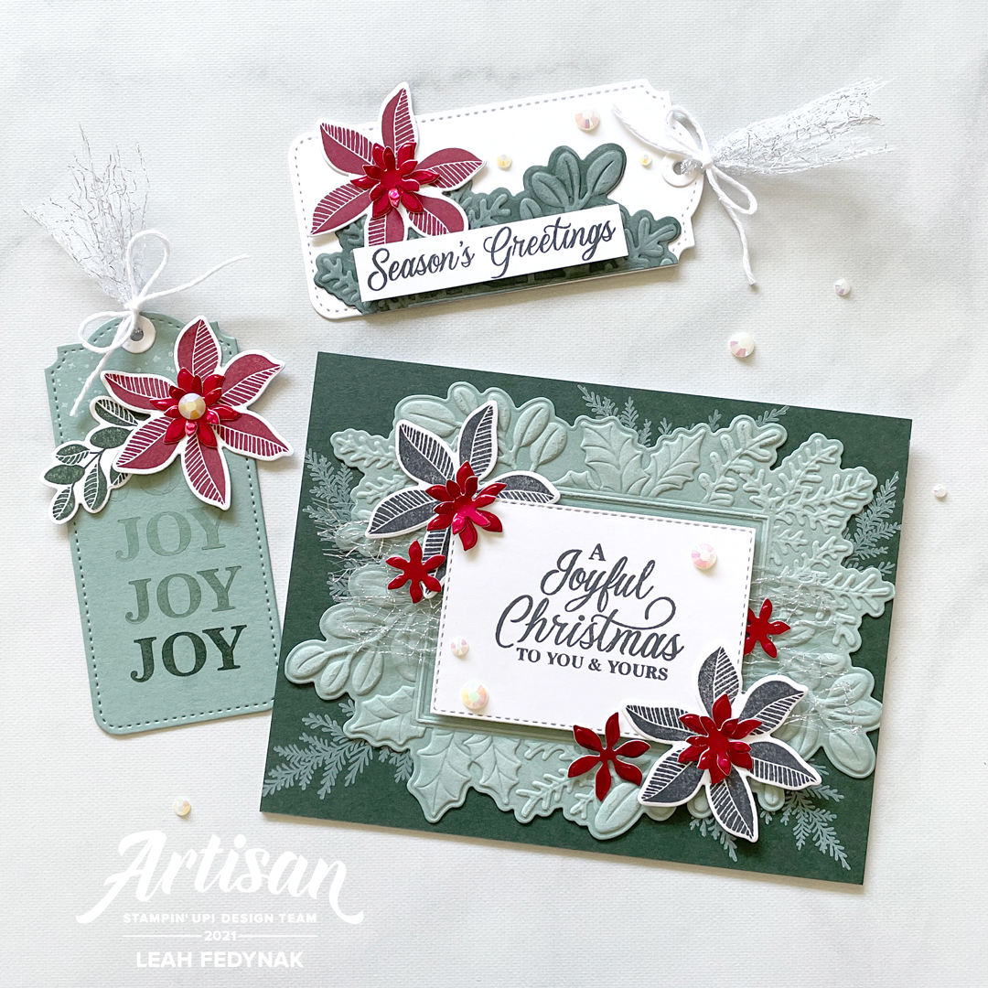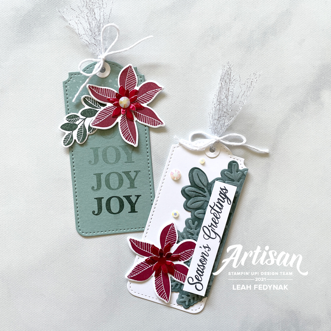 I also made two tags that coordinated with the Christmas card using the Tailor Made Tags Dies. The first tag, in Soft Succulent, was stamped with the “JOY” stamp several times in Evening Evergreen to give an ombre look. This time the large flowers were stamped in Cherry Cobbler and given a Red Foil flower center. The second tag used an edge of the embossed and die cut Evening Evergreen image along with the beautiful red flowers and a simple greeting.