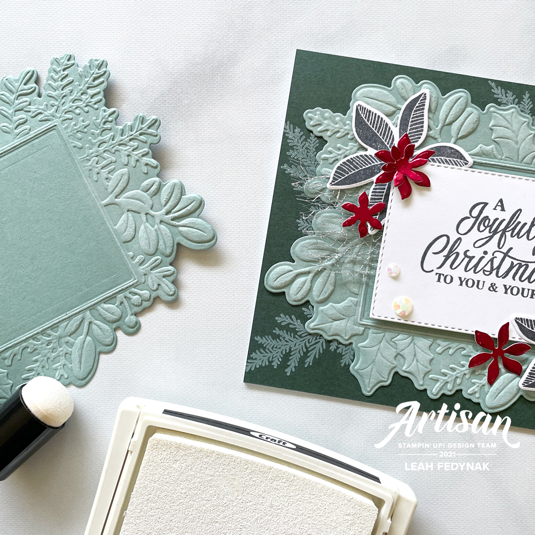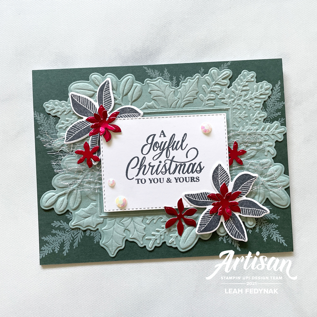 The card I made with this bundle used the second combination, hybrid embossing folder and the outline die, with Soft Succulent cardstock. I layered it on an Evening Evergreen card base that was stamped with White Craft Ink “greenery”. The large flowers were stamped in black and die cut, while the small flowers were die cut from Red Foil Sheets. The silver Metallic Mesh Ribbon was added under the greeting for a little sparkle and the card was finished off with my favourite gems, From My Heart Faceted Gems.