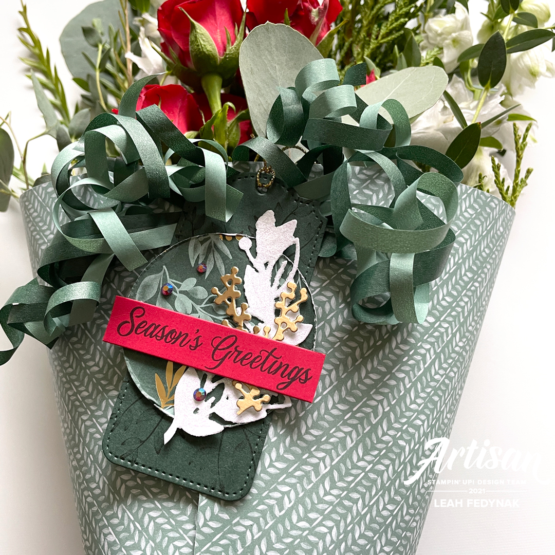 The second project was a flower wrap with gift tag. I used one full sheet of DSP with Tear & Tape Adhesive to wrap these gorgeous flowers and foliage from Bunches Flower Co.