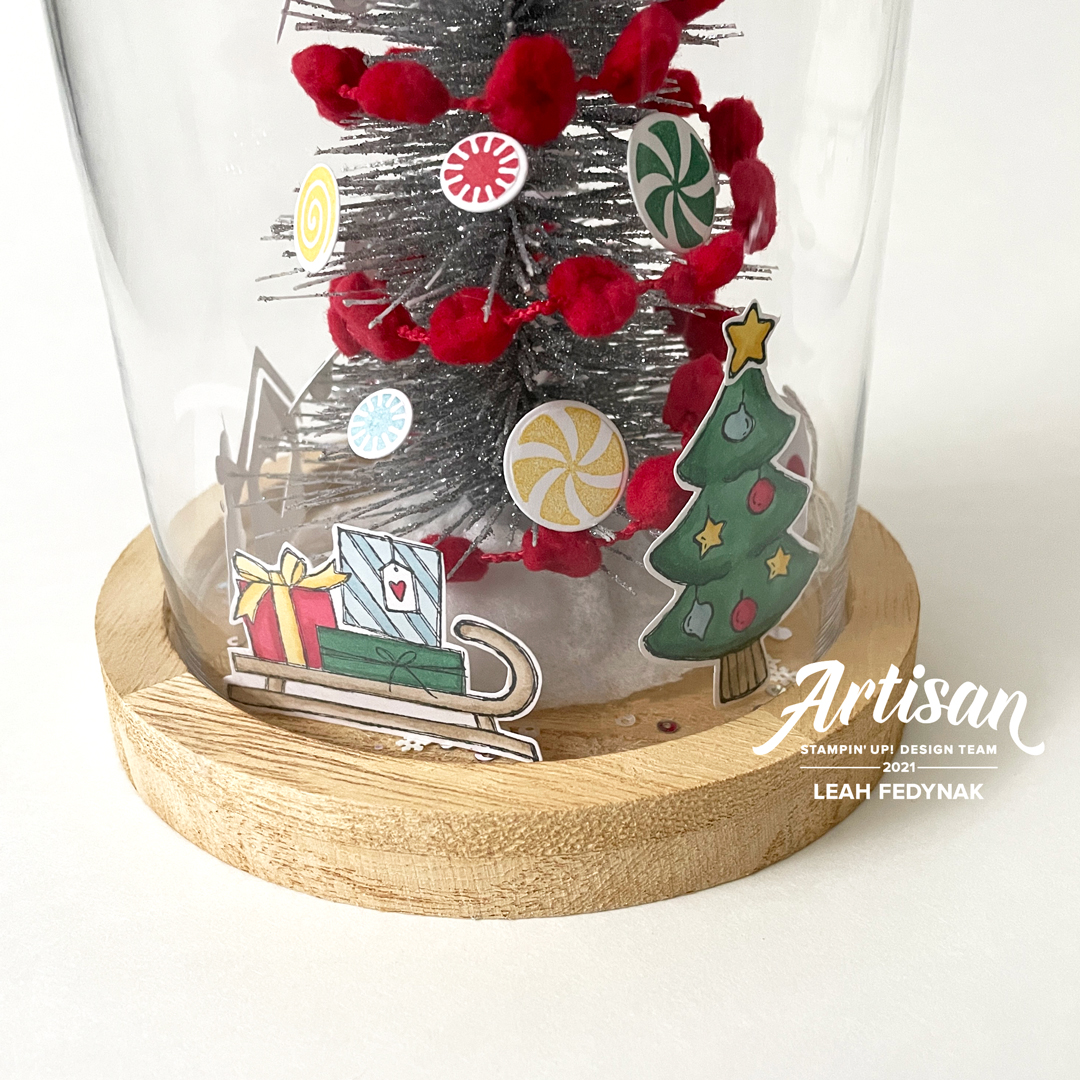 I had the cloche and the silver tree already and decided to decorate it with peppermints from the Gingerbread & Peppermint Bundle, Pom Pom Trim, and the Be Jolly stamps. The images at the base of the tree were stamped in black ink and coloured with Stampin’ Blends. The peppermints were stamped in traditional holiday colours: Shaded Spruce, Real Red, Daffodil Delight, and Balmy Blue. I also added a Fa la la la la tag from Holly Jolly Wishes and a sweet polar bear from last years stamp set, Warm & Toasty.