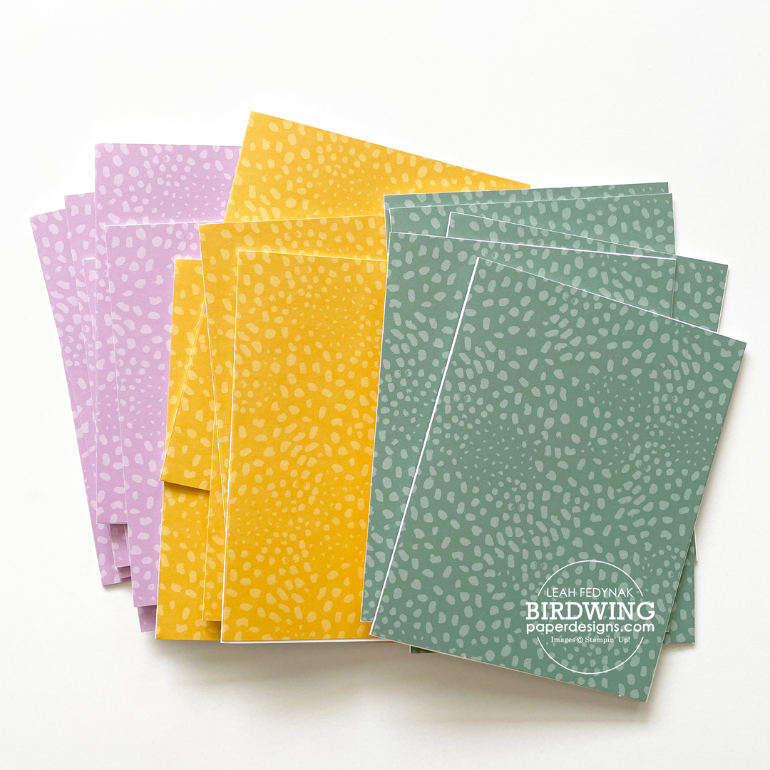 When the card bases have patterns on the front and back, I always cut them in half and adhere to my own white card base so I can start with twice as many cards! I now have 18 cards ready to go in three different colours: Fresh Freesia, Bumblebee, and Soft Succulent.