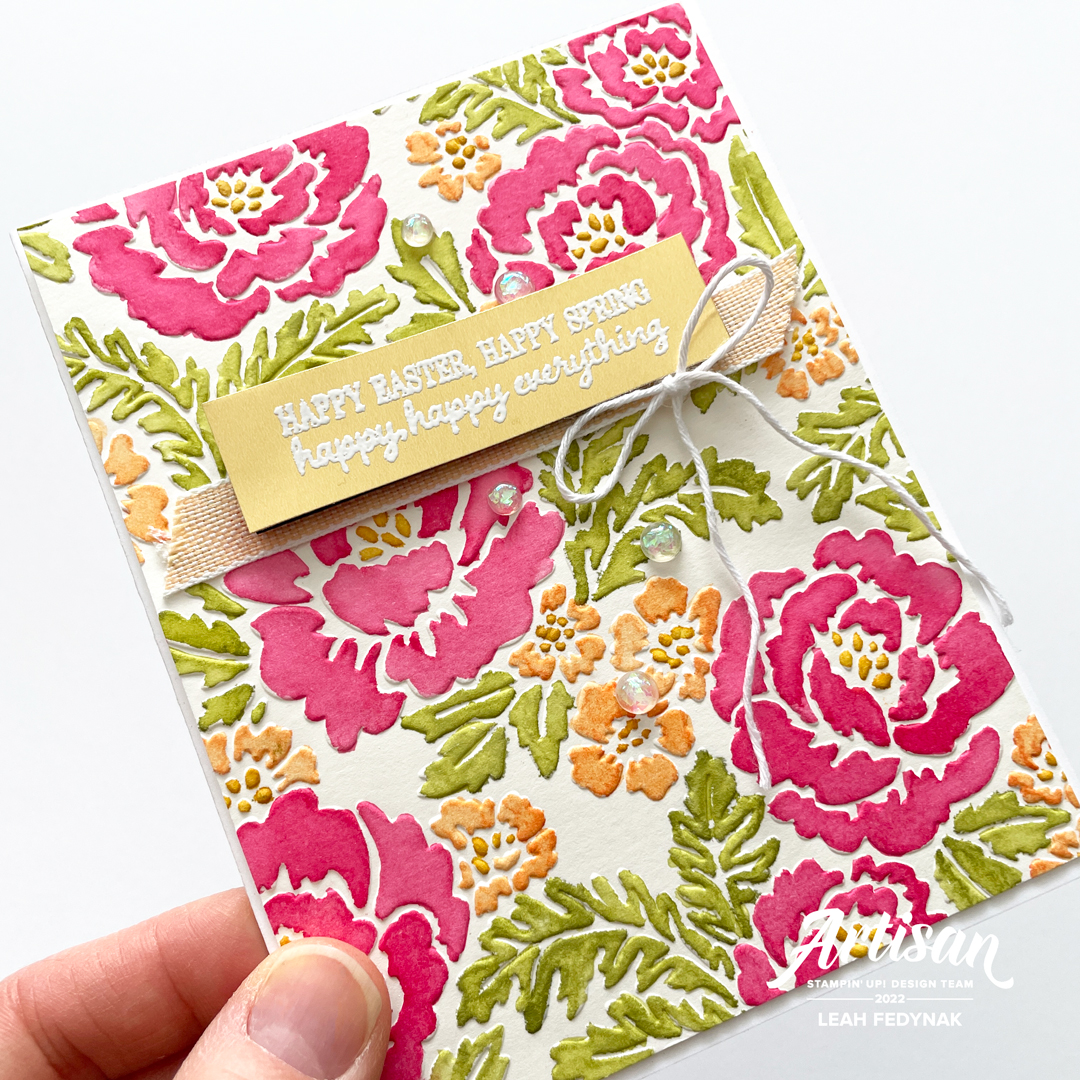 One of my favourite embossing tools from Stampin’ Up! is the Pretty Flowers Embossing Folder. The delicate floral designs make for a stunning background when embossed in cardstock, but I wanted to try something different and add watercolours to it.