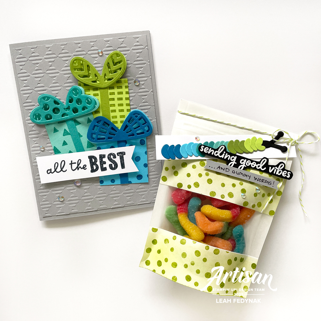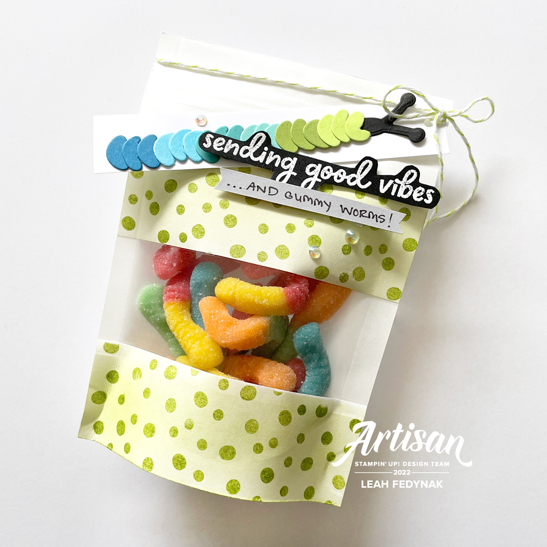 The one thing this bundle was missing was a caterpillar to go with the butterflies, so I made one out of the little flower dies. I simply glued the tiny die cut flower shapes in a line and added antennae. This critter is the perfect addition to a bag full of gummy worms using the new Peekaboo Treat Bags.