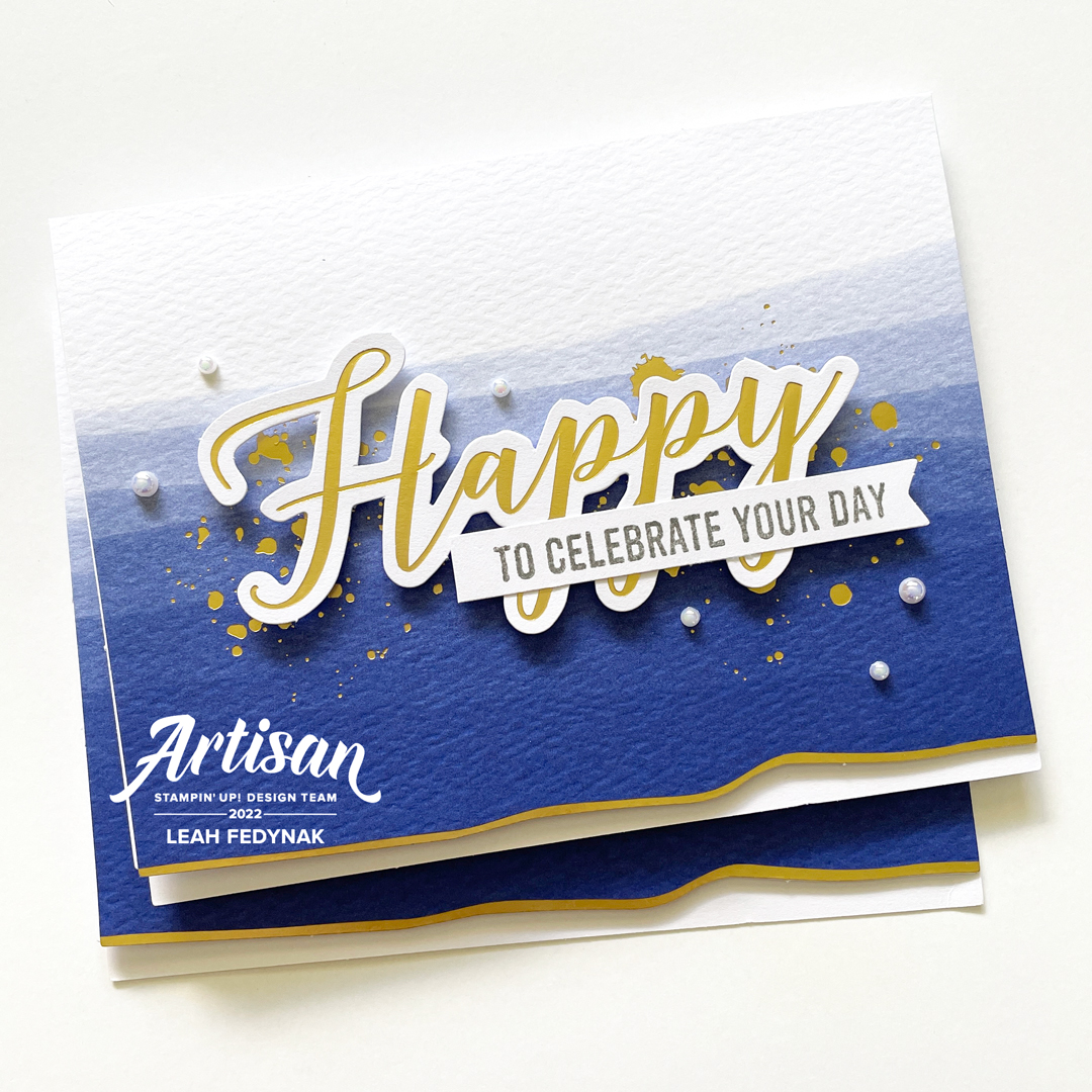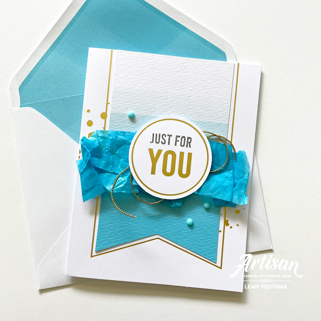 I just loved the blue tissue that came in the Paper Pumpkin box and used it on the card below as a bright accent behind the greeting. I also added gold trim to go with all the gold on the premade card base.