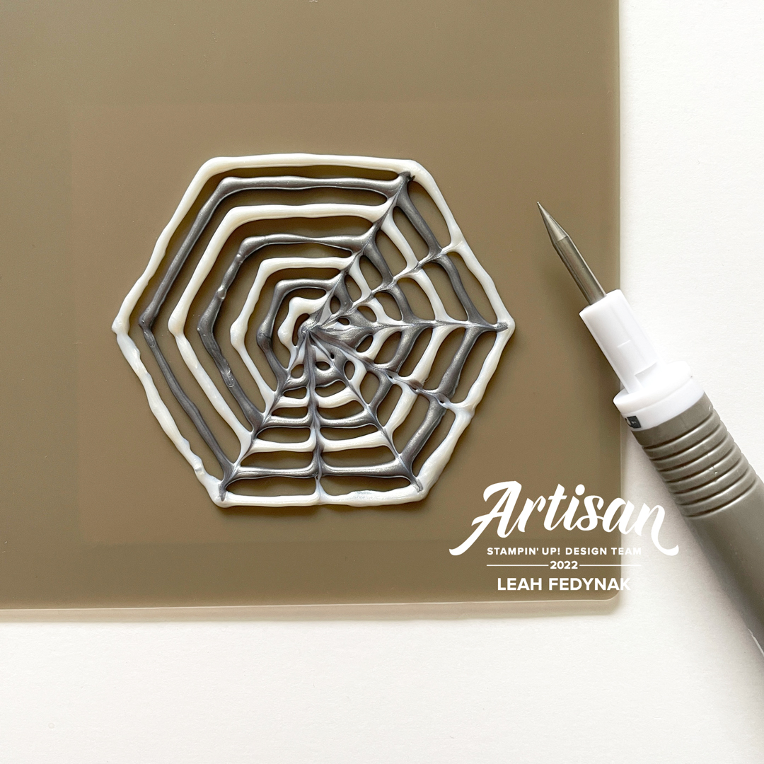 Because it comes in a bottle as a lacquer, you can make dots, lines, shapes, or words. I decided to see how it would work if you combined two colours, and used it to make a spider web for a Halloween card.