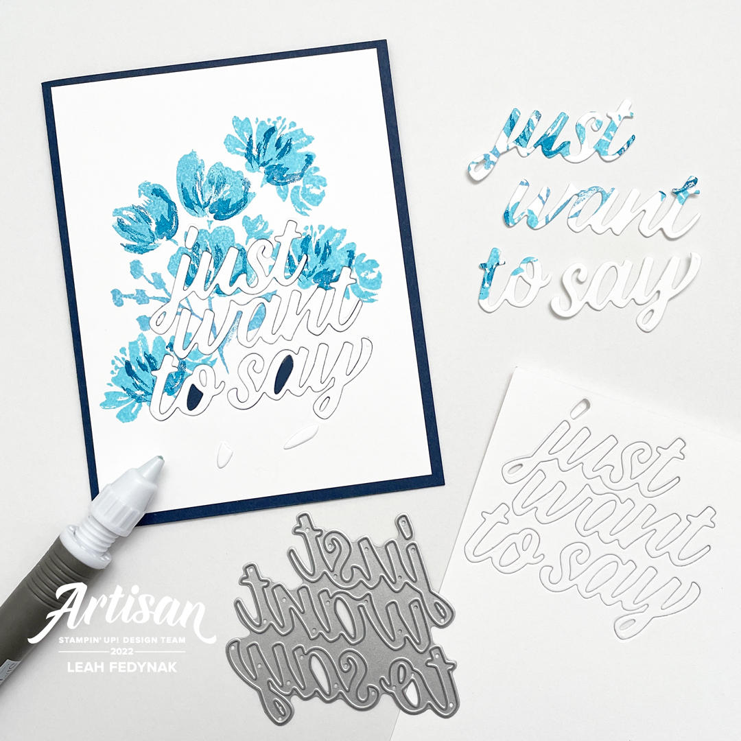 To finish the technique, add the remaining two white die cut greetings before finishing with the stamped greeting on top. I used Multipurpose Liquid Glue to glue down all the die cuts, but you could also use the Adhesive Sheets. The resulting effect is a subtle pop of the greeting that takes your card to the next level.