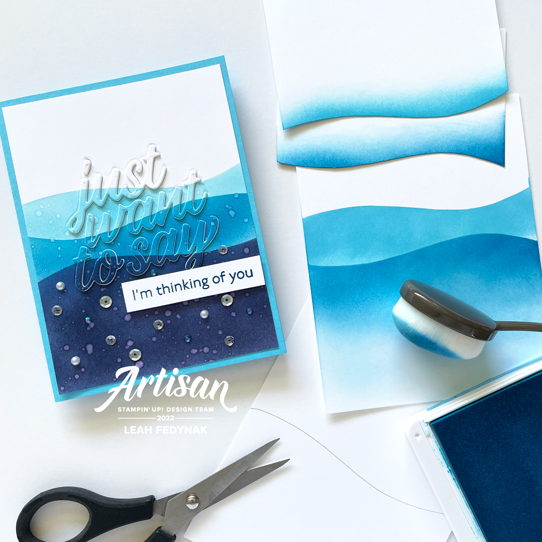 The second card uses the same Eclipse Technique but with a fun blended pattern. It’s easy to make the wave template for blending: draw a wavy line on a piece of cardstock and cut. Start the blending at the top with Tahitian Tide, flip the template and blend Pacific point, then flip the template one more time to add Night of Navy to the bottom of the card. I also added some drops of water with a Water Painter to give a splatter effect. The Eclipse Technique on this card is very effective with the words cutting through all the layers of blue.